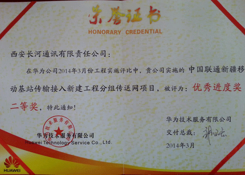 西安長河第三事業(yè)部在華為公司2014年3月份實施工程評比中獲得優(yōu)秀進度獎 二等獎!