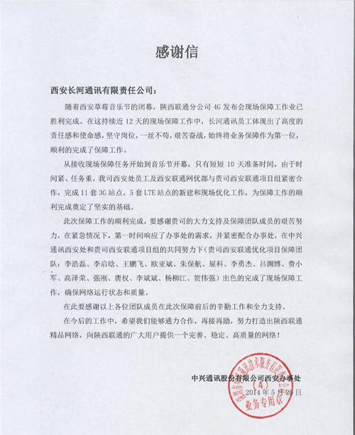 喜報:十五&十一事業(yè)部聯(lián)通3G LTE項目喜獲中興辦事處感謝信